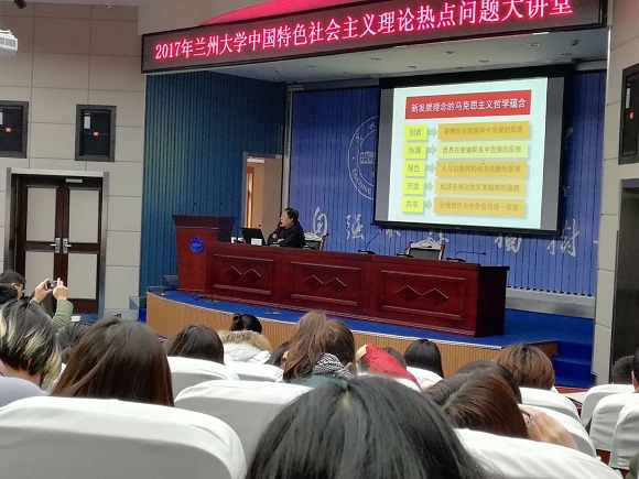 党的十九大报告把“坚持新发展理念”作为我国新时代中国特色社会主义的一项基本方略,同时系统阐述了“贯彻新发展理念,建设现代化经济体系”的目标要求。为帮助广大师生全面准确理解新发展理念与现代化经济体系的丰富内涵、核心要义,11月28日下午,由党委宣传部、研工部、学工部、马克思主义学院主办的2017年兰州大学“中国特色社会主义理论热点问题大讲堂”第六讲在逸夫科学馆报告厅举行,马克思主义学院教授、博士生导师王维平应邀作了题为《新发展理念与现代化经济体系建设》的主题报告,200余名师生聆听了报告会。报告会由学院副院长杨宏伟教授主持。